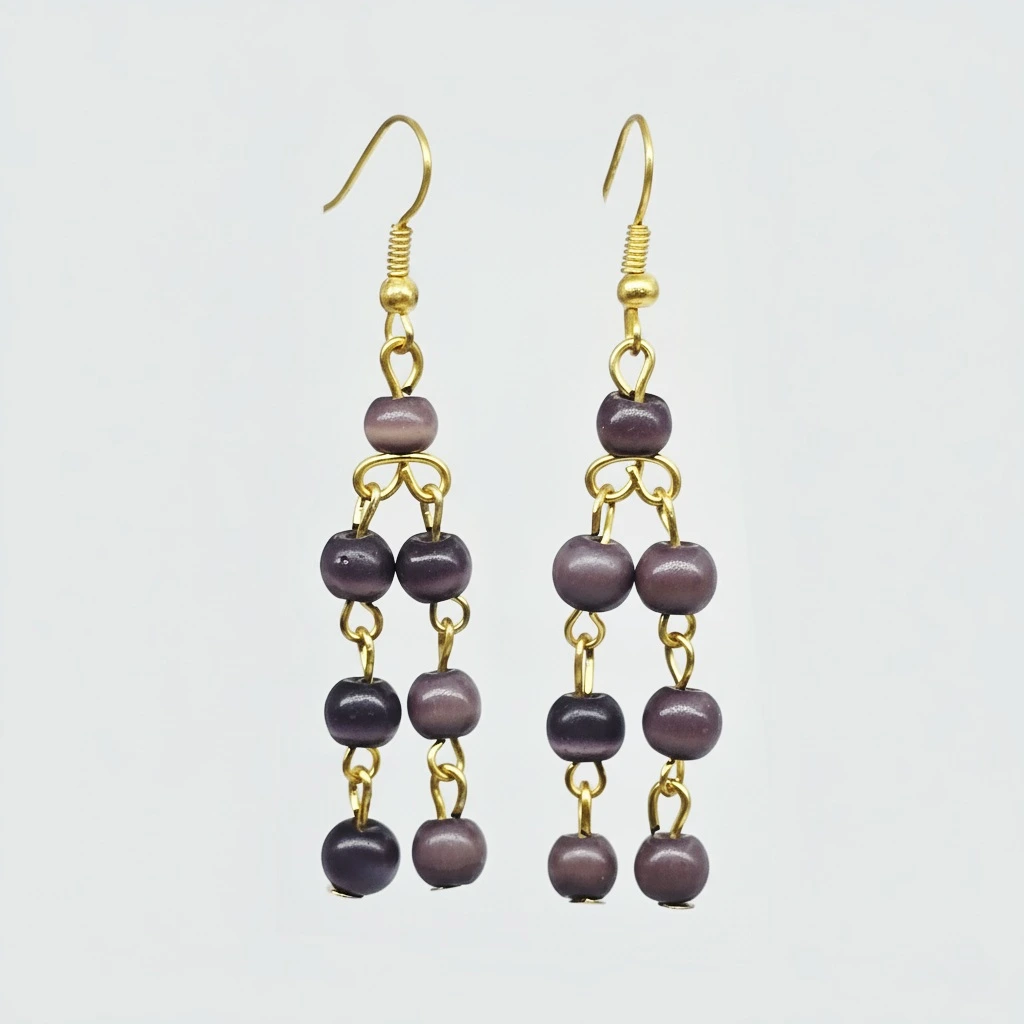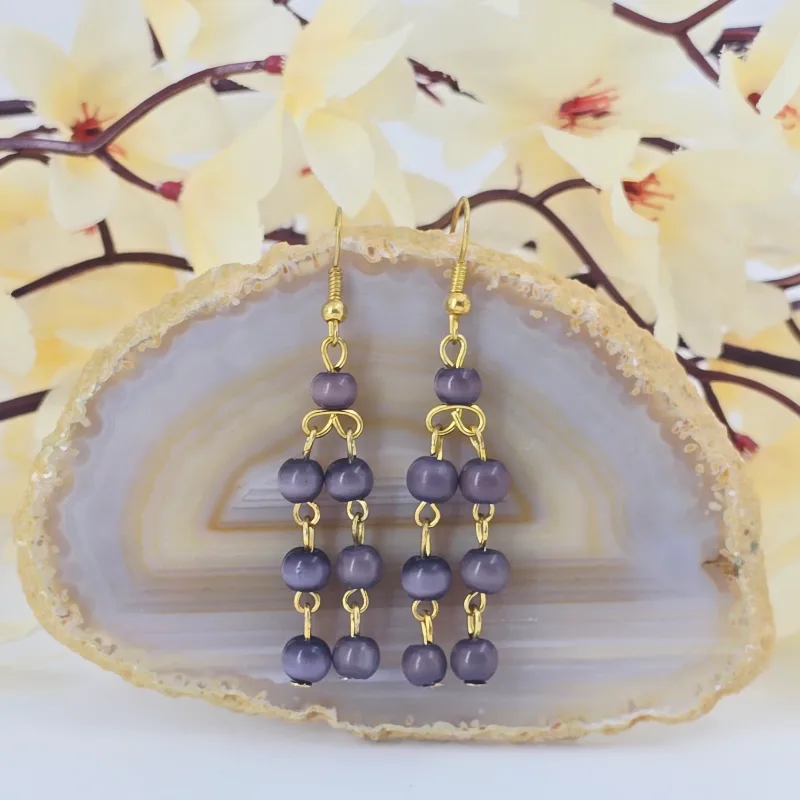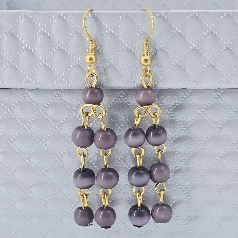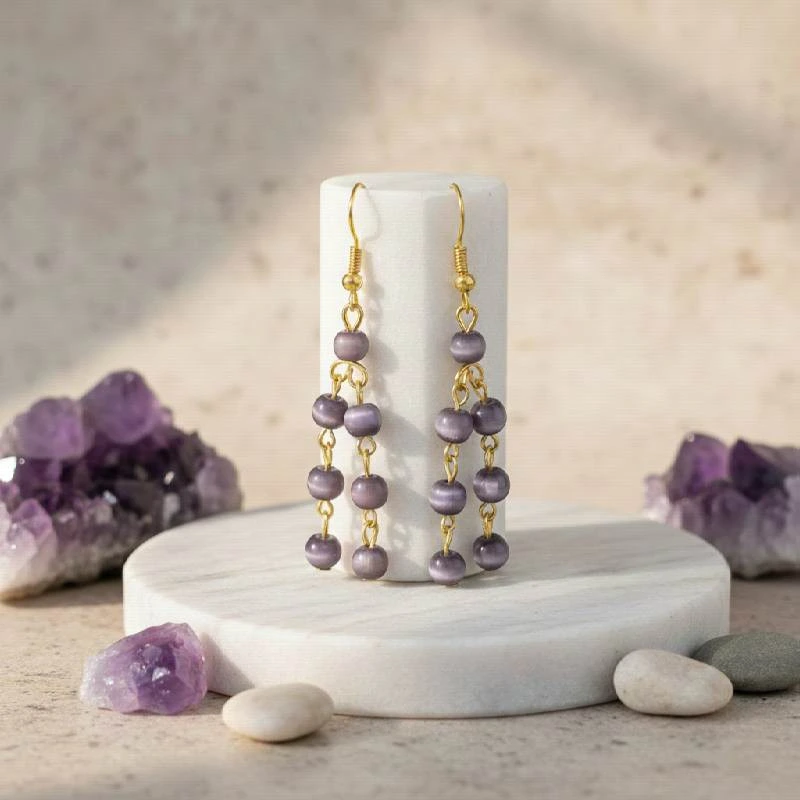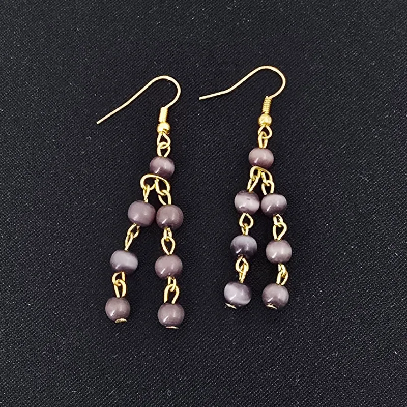 Aretes de 5.8 cm de largo de piedra ojo de gato de 4 mm, montado en metal y arillo africano.
