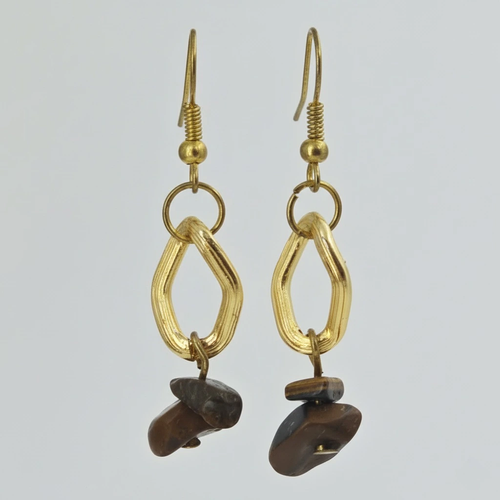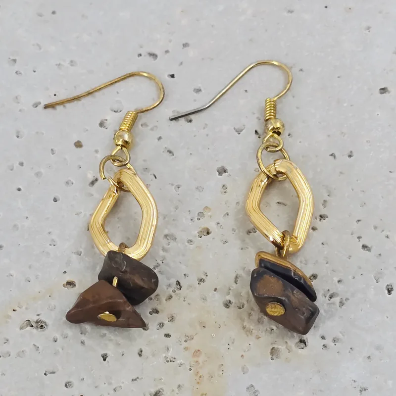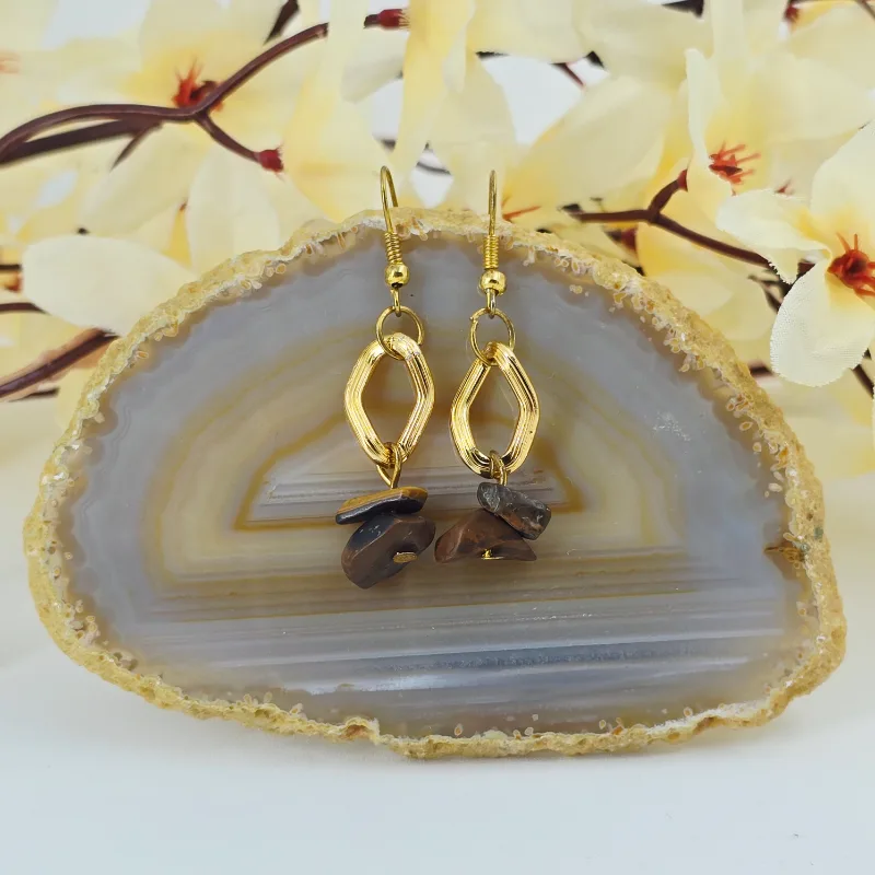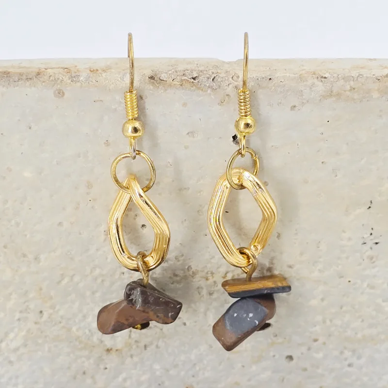 Aretes de piedra chip ojo de tigre, montado en acero con cadena de acero inoxidable y arillo africano.