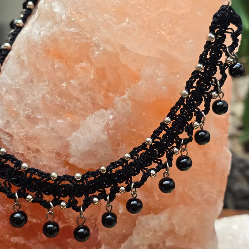 Collar de 39 cm de largo expandible hasta 46.5 cm de largo de cristal esfera lisa de 8mm, esfera metálica de 4 mm montado en hilo fantasía tejido a mano con ganchillo y cierre de broche perico.