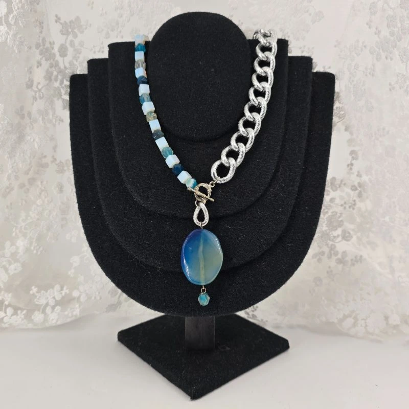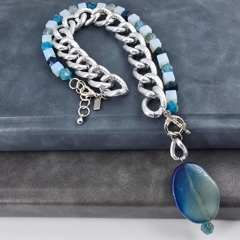 Collar de piedra de ágata facetada, cubo de piedra luna, broche en adorno y ágata en forma ovalada, montado en alambre con cadena de acero inoxidable y broche perico.
