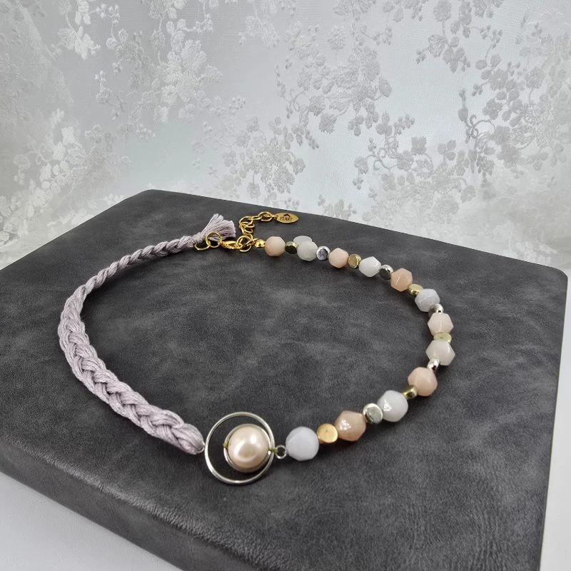 Collar de piedra cuarzo facetado, cuenta madre perla, cuenta redonda espaciadora en dos tonos, hilo trenzado y broche perico.
