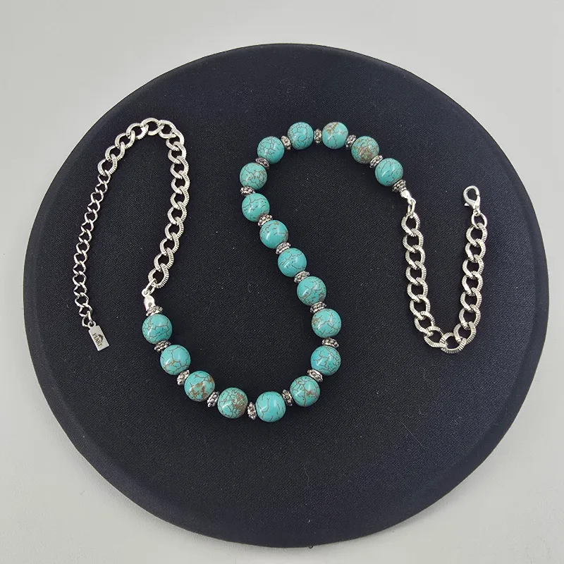 Collar de 47 cm de largo expandible hasta 53 cm de largo de piedra turquesa de 12 mm con separador de pewter, montado en alambre con cadena de acero inoxidable y cierre de broche perico.