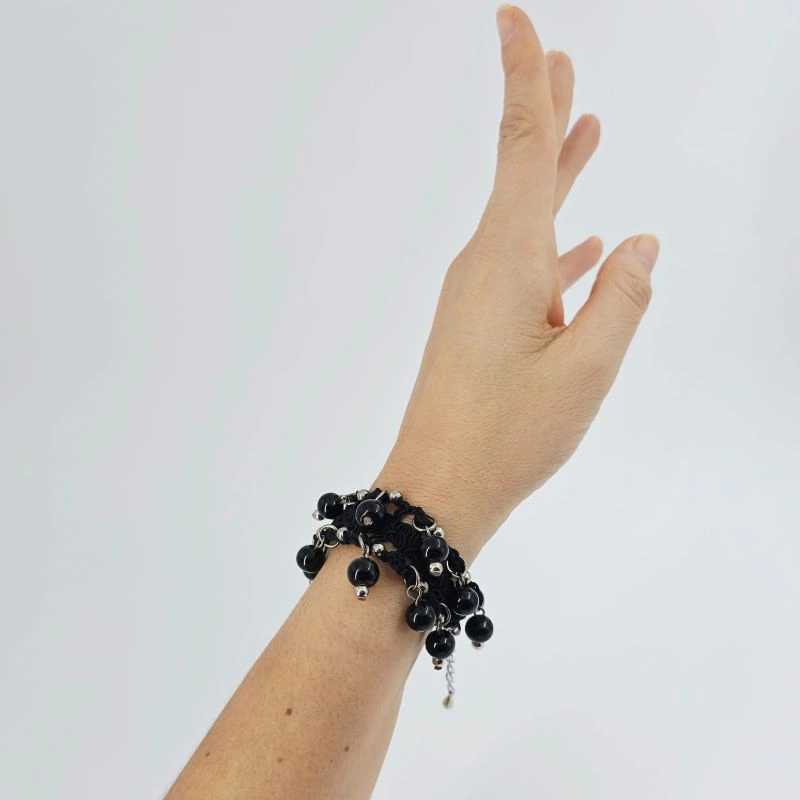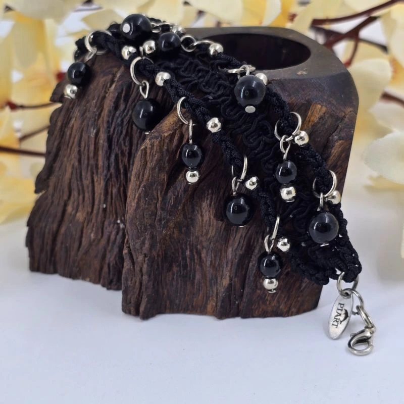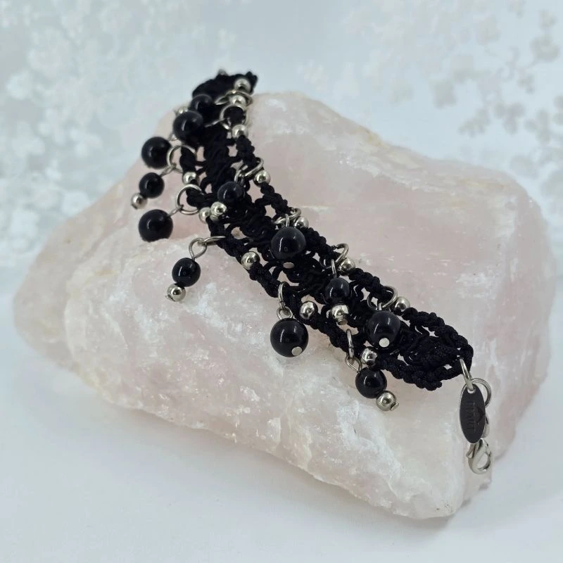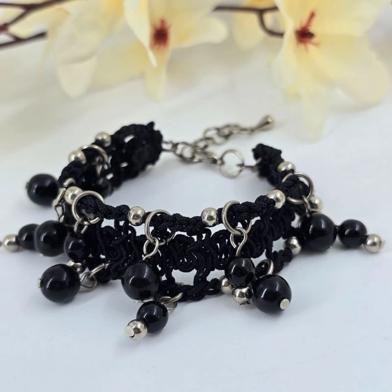 Pulsera de cristal, galón, hilo fantasía tejido a mano y broche perico.