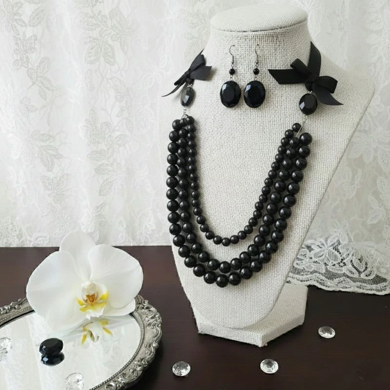 Aretes de 5.7 cm de largo con cristal esfera lisa de 6 mm, cristal oval facetado de 30x20 mm, montado en acero y arillo africano.; Collar cerrado de 100 cm de largo de perla base cristal de 3 medidas de 12, 14 y 16 mm, cuentas oval cristal checo facetado de 25x20 mm, montado en alambre y cerrado con listón popotillo con moños de 25x50 mm.