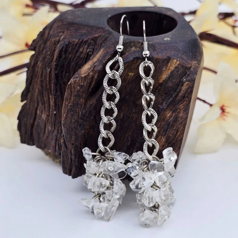 Aretes de 8.4 cm de largo con piedra chip cuarzo de diversos tamaños, montado en cadena de acero inoxidable y arillo africano.; Collar de 40 cm de largo expandible hasta 54 cm de largo de cuarzo chip de diversos tamaños con cadena de acero inoxidable y cierre de broche perico.