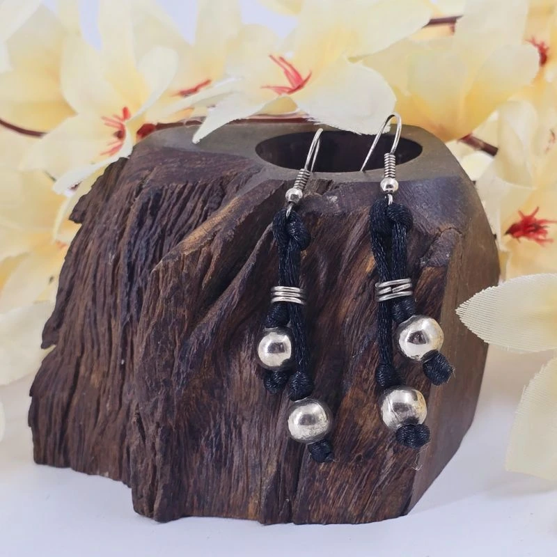 Aretes de 6 cm de largo de esferas metálicas de 8 mm, montado en cola de rata con argollas y arillo africano.; Collar de 65 cm de largo de esferas metálicas de 10mm, montado en cola de rata y cierre de broche perico.
