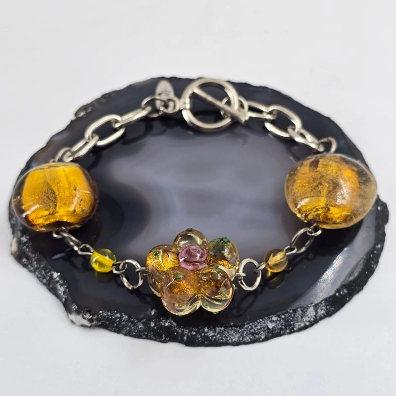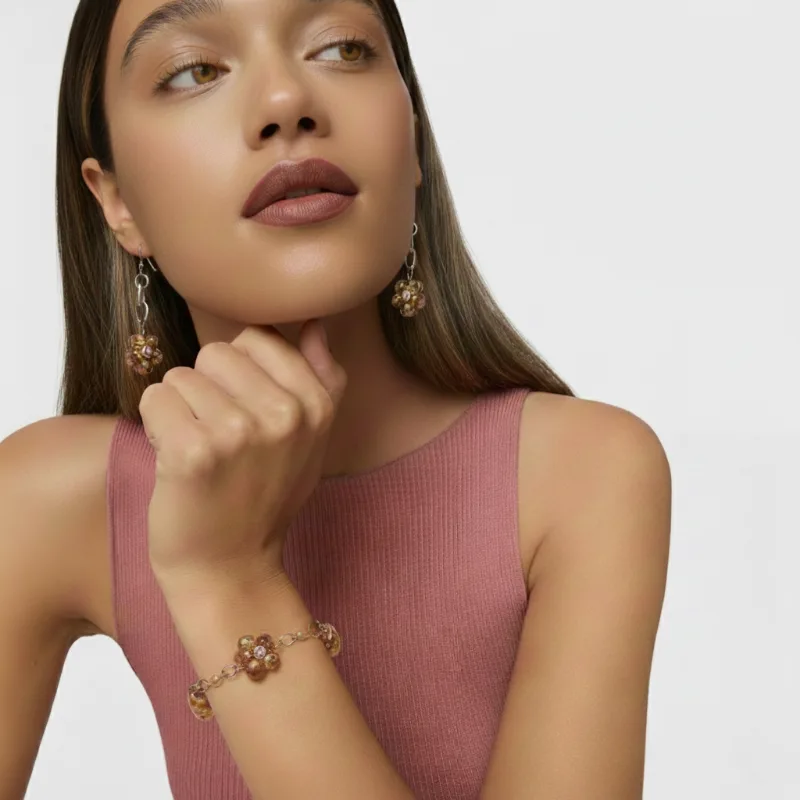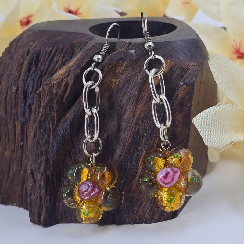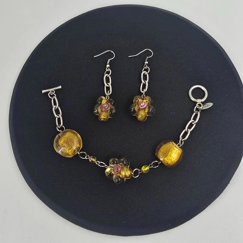 Aretes de 5.5 cm de largo de cristal murano en forma de flor de 18 mm, montado en cadena de acero inoxidable y arillo africano.; Pulsera de 19.5 cm de largo de cristal murano en forma de luneta de 18x20 mm, cristal murano en forma de flor de 20 mm, montada en cadena de acero inoxidable y cierre de broche T liso.