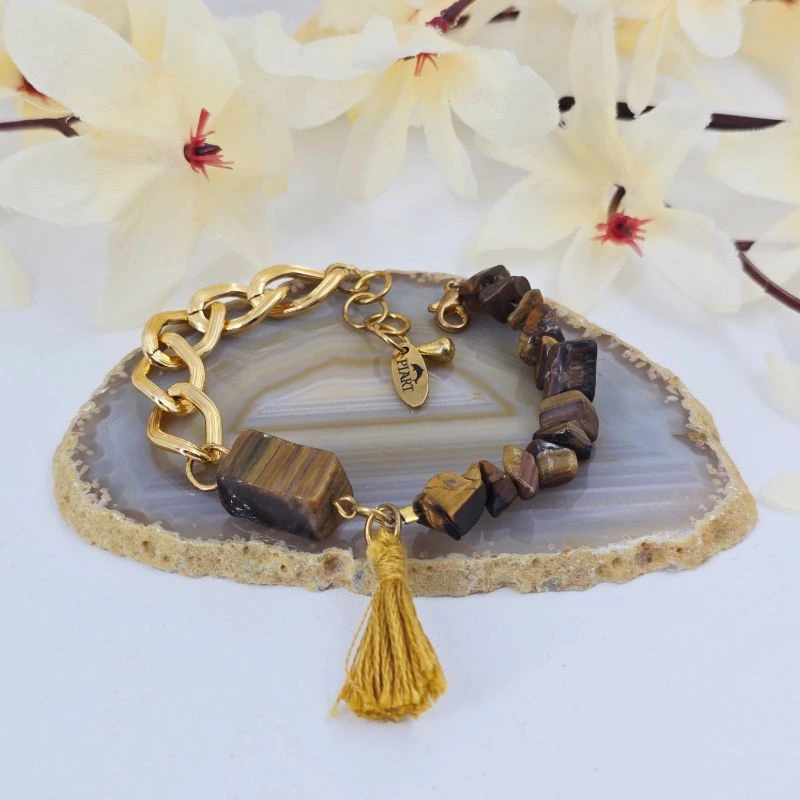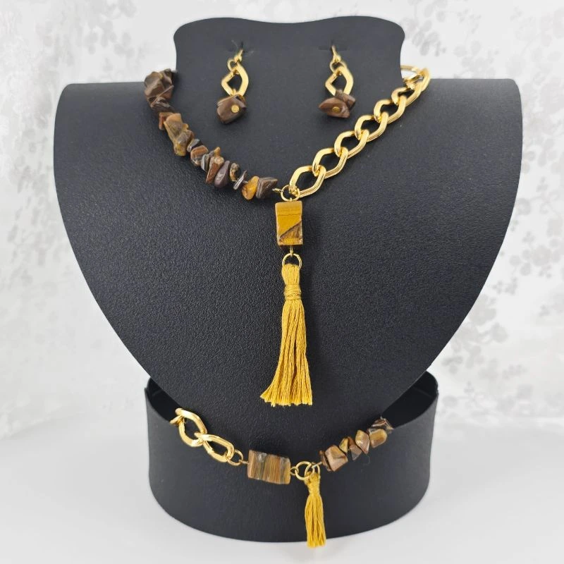 Set de Collar, Pulsera y Aretes de piedra chip ojo de tigre, montado en acero con cadena de acero inoxidable y pompón