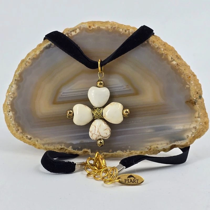 Aretes de 5 cm de largo de piedra turquesa en forma de corazón barnizada de 10 mm, montado en acero con esferas metálicas y arillo africano.; Collar de 32.5 cm de largo expandible hasta 38 cm de largo de piedra turquesa blanca barnizada de 10 mm en forma de corazón, formando un trebol de 30 mm con cuentas metálicas de 2mm con alambre, montado en listón terciopelo y cierre de broche perico.; Pulsera de 17 cm de largo expandible hasta 21 cm de largo de piedra turquesa blanca barnizada de 10 mm en forma de corazón, formando un trebol de 30 mm con cuentas metálicas de 2 mm y alambre, montado en listón terciopelo y cierre de broche perico.